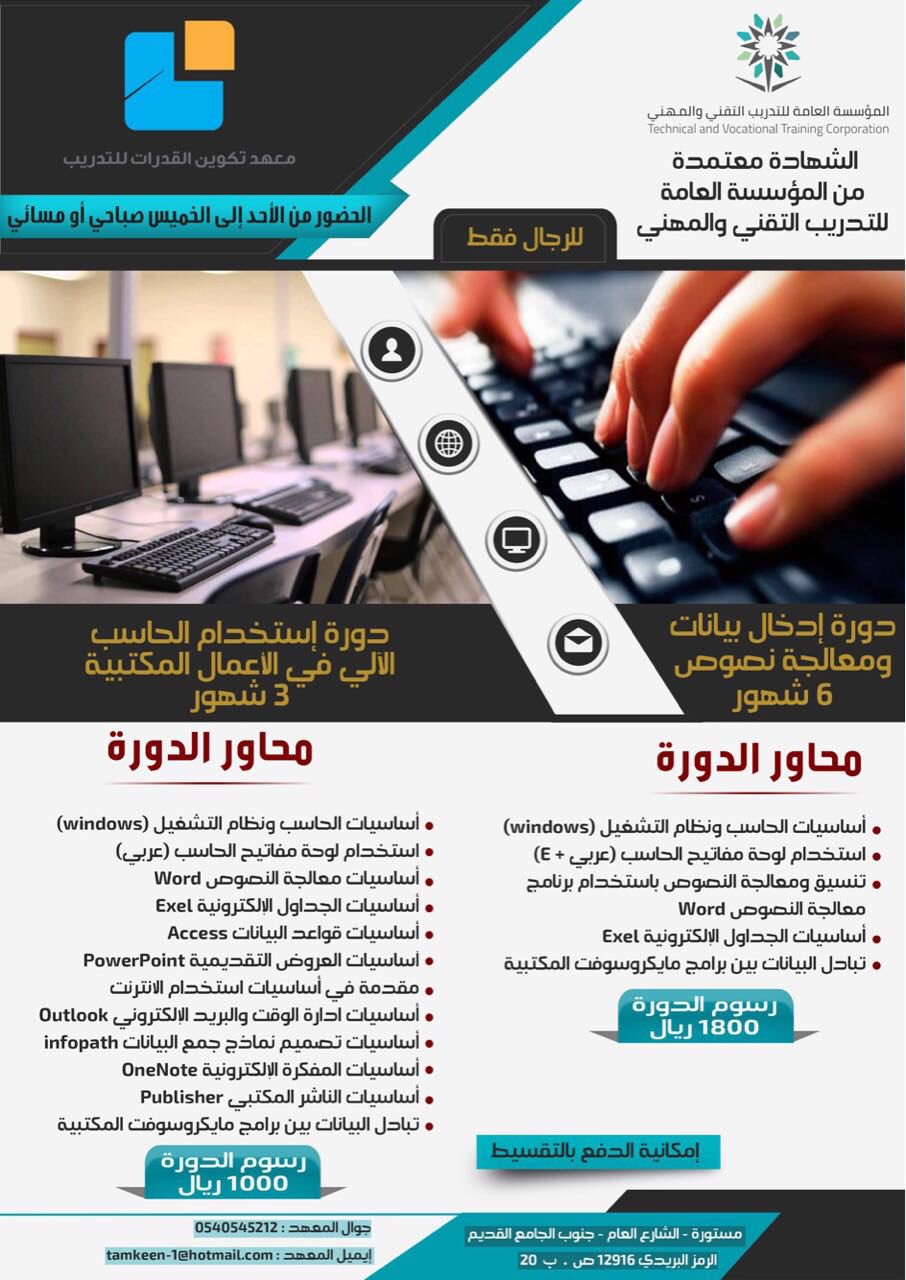 استخدام الحاسب الآلي في الأعمال المكتبية 3 شهور مدينـة جـدة رجـال فقـط دورة مدخل بيانات شهر واحد مدينـة جـدة رجـال. 14 مراقب تحميل العدد 5 وظائف ويشترط الحصول على الثانوية العامة بالإضافة إلى دورة حاسب آلي لمدة 3 شهور. دورات حاسب الي معتمده عن بعد احصل على دورات حـاسب الـي بـسعـر رمـزي معتمده من صندوق الموارد البشرية الانجاز خلال يوم تاصلك الشهاده ملف pdf الاسـعـار على حسب عداد الساعات 1 دورة حـاسب الـي فــنــي دعـــم تكـنولوجـيا المعلومات. صلاة الظهر من الساعة 12 30 الى الساعة 1 مع طباعة التقويم.
